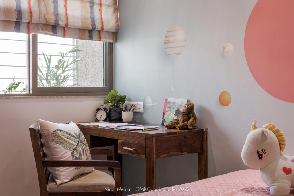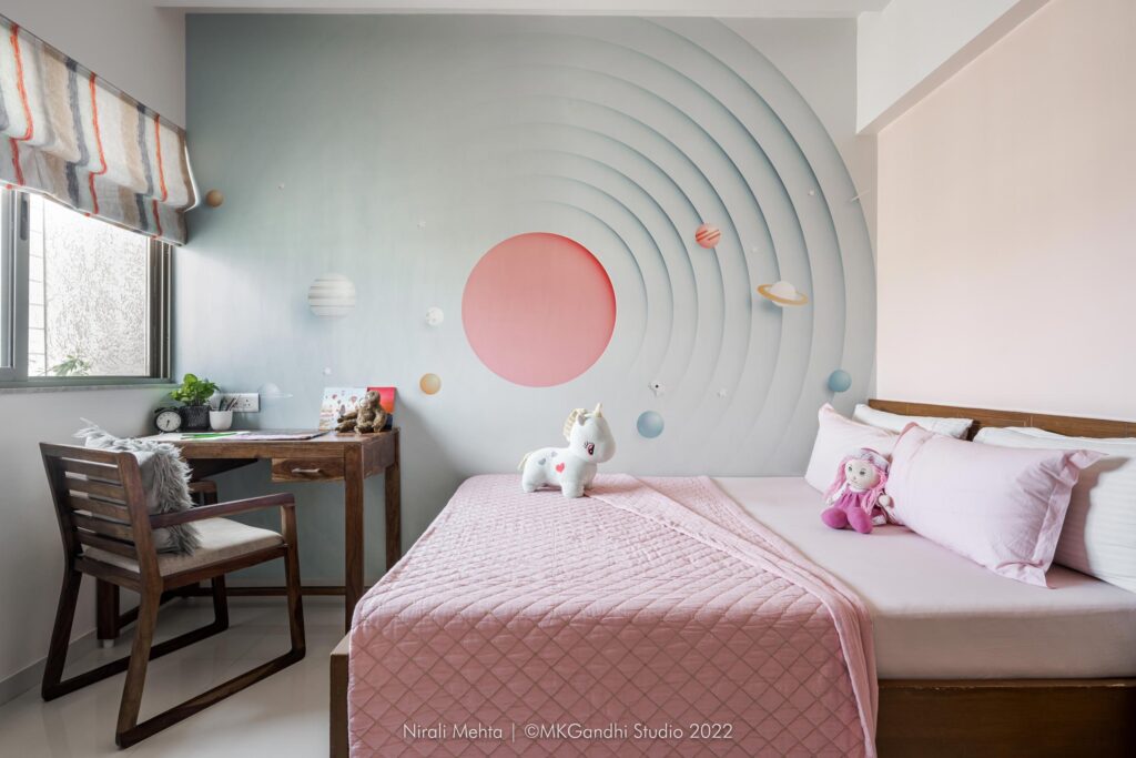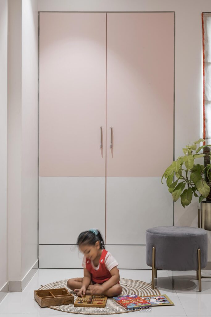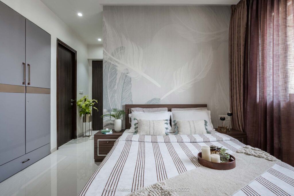 In the kid’s bedroom, playful practicality takes center stage. The bed is tucked against the wall to leave floor space open for play, while blue and pink wallpaper brings vibrancy and charm. The master bedroom, in contrast, leans into sophistication with customized wallpaper and warm wooden elements, offering a serene retreat tailored to the client’s lifestyle. Bathrooms echo the same ethos of functionality and modern simplicity, using neutral palettes and clean lines to create a sense of spaciousness.