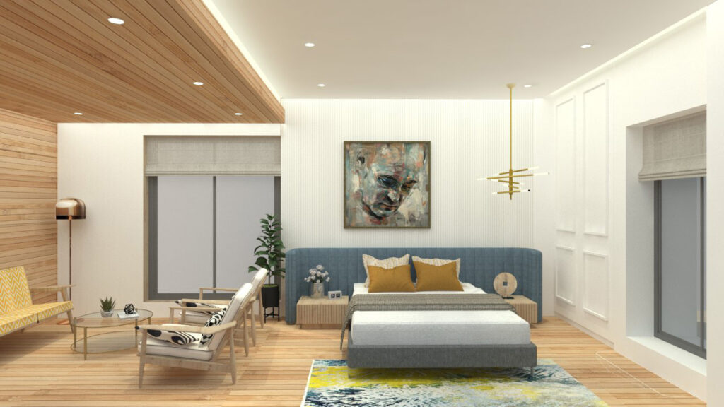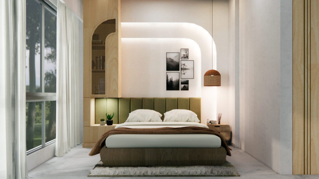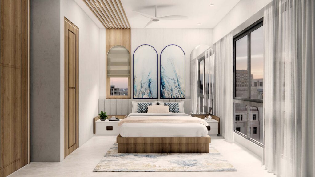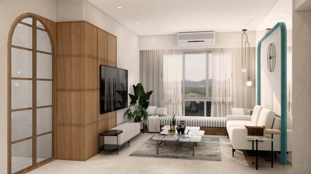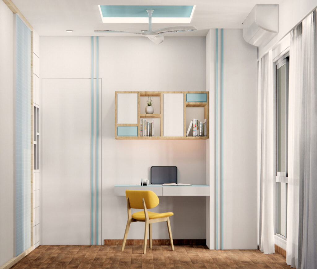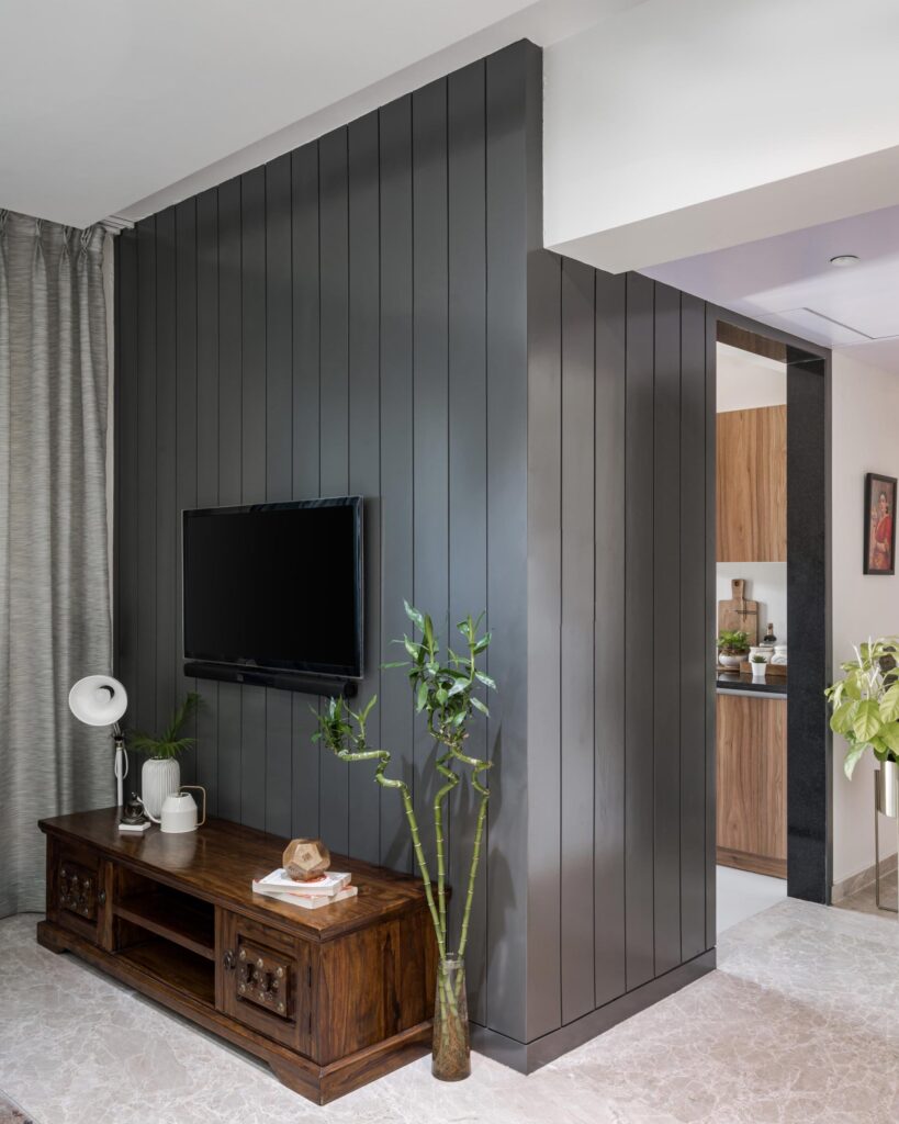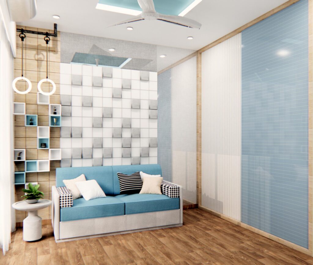 The living room strikes a balance between cozy and modern, with Indian seating for added warmth and a mirrored wall that makes the space feel more expansive and inviting. The kids’ bedroom, imagined as a play zone, study area, and occasional guest room, was brought to life with multifunctional furniture and a carved square-pattern headboard that adds a playful yet sophisticated touch. Every detail—from materials to lighting—was curated to create a home that is practical, modern, and full of charm. Whispering Hues is more than just a residence; it’s a canvas of family moments, bold choices, and everyday comfort.
