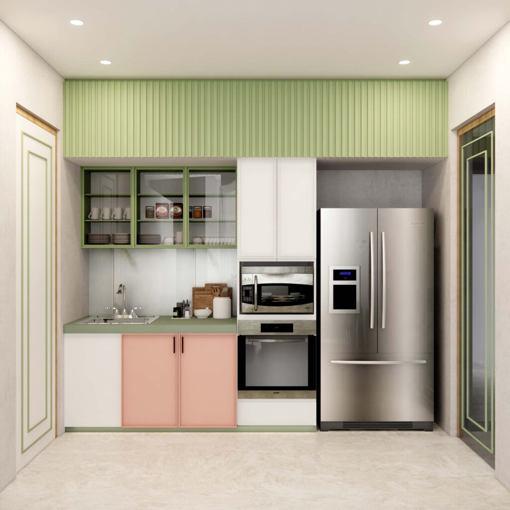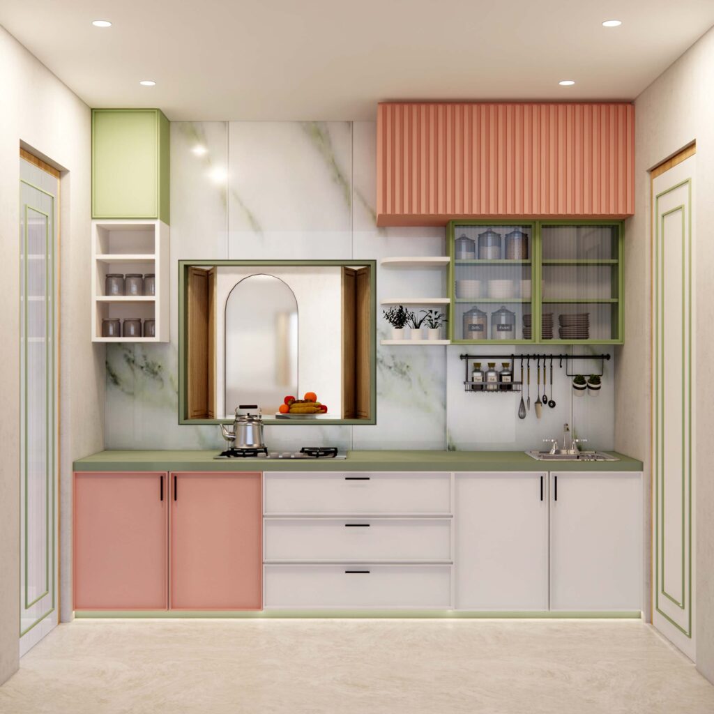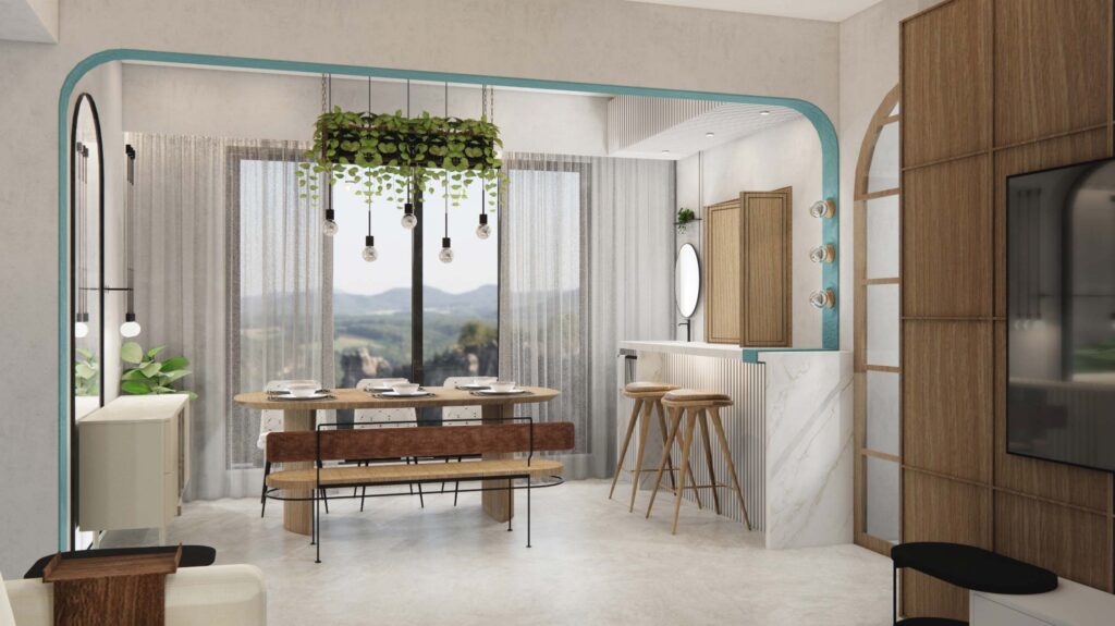 For a family that values togetherness, Whispering Hues was designed to nurture connection and comfort in every corner. The heart of the home—kitchen and dining—was opened up with a sliding-folding window, allowing conversations to flow seamlessly while maximizing light and space. Smart storage under the breakfast counter and a tucked-away washbasin keep functionality intact, while bold colors and a striking backsplash bring in a glamorous personality that reflects the homeowners themselves.